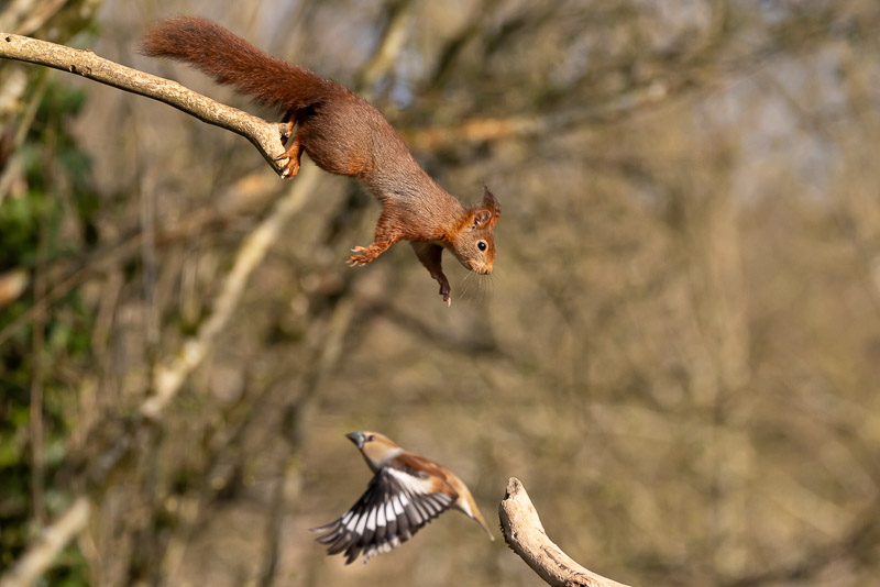 Écureuil roux et gros-bec casse-noyaux (Affûts de "La Cassine")